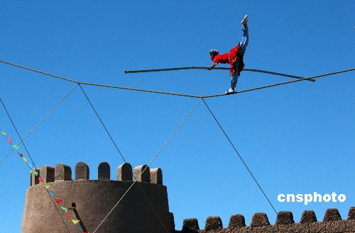 “達(dá)瓦孜”維吾爾語(yǔ)的意思是高空走大繩,古稱(chēng)“走索”,是新疆維吾爾族傳統(tǒng)的民間雜技表演藝術(shù),源于兩千多年前的西域,據(jù)說(shuō)在新疆也只有一個(gè)家族從事這項(xiàng)表演,多次創(chuàng)造吉尼斯世界紀(jì)錄的著名藝術(shù)家阿迪力就出生于新疆喀什地區(qū)英吉沙縣,是達(dá)瓦孜傳人。圖為在喀什維吾爾民族風(fēng)情園中表演達(dá)瓦孜的十二歲小姑娘,正在約三十米高的繩索上展示單腿平衡絕技。作者:田地