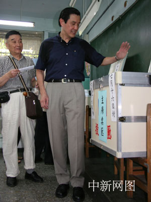 7月16日,中國國民黨主席選舉在全臺601個投票所展開。圖為1號參選人、臺北市長馬英九在居家附近的臺北興德小學(xué)參加投票,將選票投入票箱的瞬間。中新社記者 董會峰