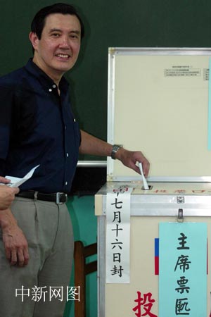 7月16日,中國(guó)國(guó)民黨主席選舉在全臺(tái)601個(gè)投票所展開(kāi)。圖為1號(hào)參選人、臺(tái)北市長(zhǎng)馬英九在居家附近的臺(tái)北興德小學(xué)參加投票。中新社記者 盛佳鵬