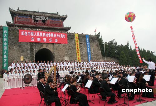 7月17日上午,一曲黃河大合唱拉開了秦皇島紀(jì)念抗日戰(zhàn)爭勝利60周年交響音樂會(huì)的序幕。河北交響樂團(tuán)與秦皇島市市民、駐軍單位、學(xué)生、曾參加長征與抗日戰(zhàn)爭的老八路等6000余人相聚在山海關(guān)長城天下第一關(guān)下,慶賀抗日戰(zhàn)爭勝利60周年。作者:學(xué)忠