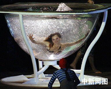 7月16日,2005世界游泳錦標(biāo)賽在加拿大蒙特利爾開幕。圖為開幕儀式上一名游泳者在圓柱形的容器上表演。
