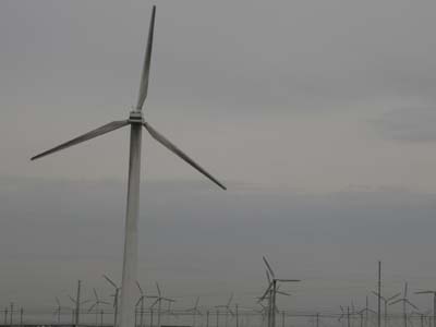 在從烏魯木齊去吐魯番的路上,一大片風力發(fā)電機挑起了不少游人的興趣。