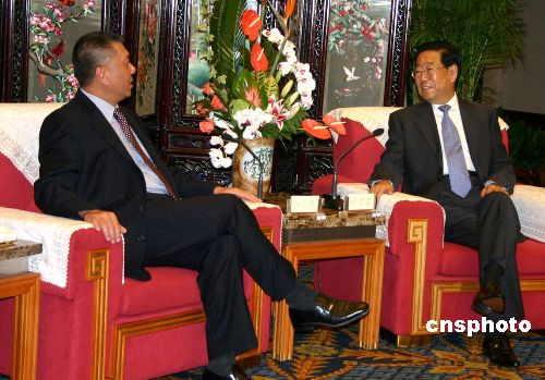 7月24日下午,澳門特首何厚鏵率團來到成都,將出席25日開幕的第二屆“泛珠三角區(qū)域合作與發(fā)展論壇”。中共四川省委書記張學(xué)忠(右)會見了何厚鏵一行。作者:楊杰