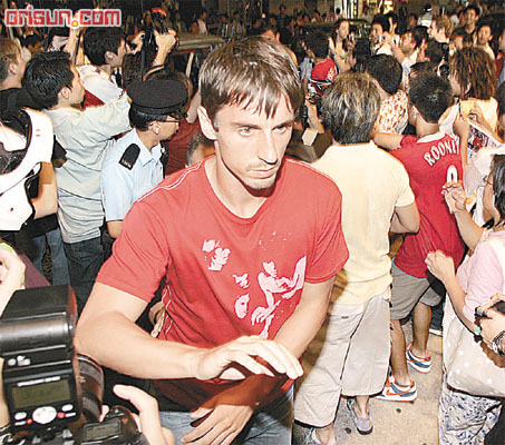 前晚十一時(shí)半,球星開(kāi)始出動(dòng)夜店,各球星包括里奧·費(fèi)迪南德,弗萊徹,魯尼,范尼斯特魯伊,西爾維斯特,阿蘭·史密斯,羅西,薩哈等在保安陪同下,浩浩蕩蕩抵達(dá)中環(huán)Kee Club,現(xiàn)場(chǎng)早有近百名球迷守候,加里·內(nèi)維爾還貪玩搞記者鏡頭,致一名記者跌倒,令隨后的斯科爾斯幾乎踩到記者身上,因場(chǎng)面混亂,要出動(dòng)十多名警員到場(chǎng)維持秩序。
