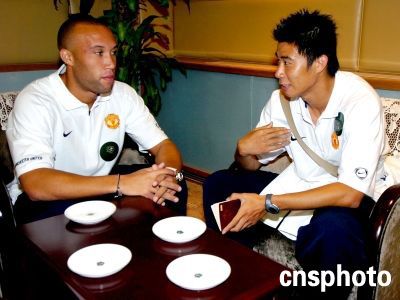 英超豪門曼聯(lián)隊昨日抵達北京,開始他們的中國之行。在未來的幾天中,他們將與中國的球迷以及媒體見面,并將與北京現(xiàn)代隊進行一場友誼賽。圖為中國球員董方卓與法國球星西爾維斯特交談。