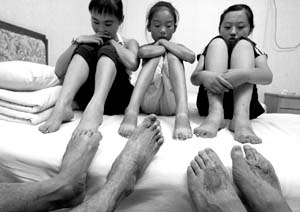 昨天晚上,記者在請?jiān)笀F(tuán)入住的賓館采訪了他們。受害者中最嚴(yán)重的王成告訴記者,兩年前,齊市某工地施工挖出5個(gè)芥子氣毒劑桶,毒劑桶隨后被賣到他工作的廢品收購站,自己因此被毒氣感染。如今,他下肢皮膚大面積壞死,連長時(shí)間的走路都成了問題。
