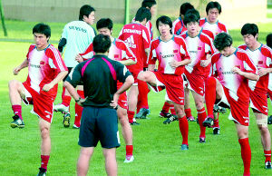 昨天傍晚5時30分開始的近兩個小時的訓練中,朱廣滬拿出40分鐘的時間專門演練前場定位球。由于孫祥感冒沒有參加昨天的訓練,罰角球的任務(wù)給了腳法秀麗的陳濤和鄭斌。