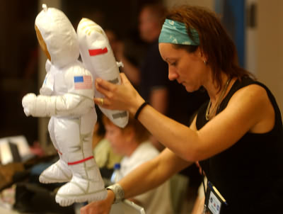 中新網(wǎng)洛杉磯七月二十九日電(記者賈國(guó)榮)一位美國(guó)女記者期待發(fā)現(xiàn)號(hào)首次太空行走成功,特意舉起一個(gè)準(zhǔn)備太空行走的宇航員卡通人,放在電腦前。