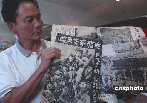 美國(guó)舊金山華人收藏家姜家聲展示在舊貨市場(chǎng)尋求的《支那事變畫報(bào)》,此為日本侵略中國(guó)和亞洲時(shí)期顯示戰(zhàn)功的出版物。姜家聲先生在今年七月紀(jì)念中國(guó)抗日戰(zhàn)爭(zhēng)勝利六十周年時(shí),用以揭露日本發(fā)動(dòng)戰(zhàn)爭(zhēng)的罪惡行徑。作者:賈國(guó)榮