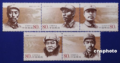 中國國家郵政局定于八月一日發(fā)行《人民軍隊(duì)早期將領(lǐng)》紀(jì)念郵票(一套五枚),特五枚郵票名稱分別為:楊靖宇(上排左一)、左權(quán)(上排左二)、彭雪楓(上排左三)、羅炳輝(下排左一)、關(guān)向應(yīng)(下排左二),面值均為八十分。作者:鄒憲