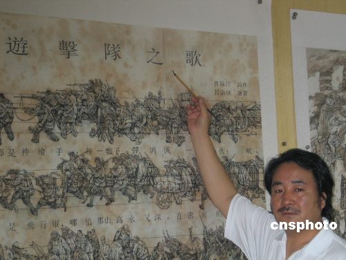 為紀(jì)念抗戰(zhàn)勝利六十周年,西安畫家賀榮敏用畫筆“畫”出《游擊隊(duì)之歌》。整幅畫卷以五線樂(lè)譜為基本構(gòu)圖,保留了樂(lè)譜線和歌詞,跳動(dòng)的音符轉(zhuǎn)化為游擊隊(duì)員戰(zhàn)斗的身影。作者:冽瑋