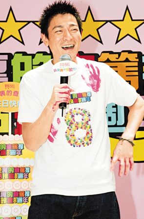 華仔昨日與商臺(tái)節(jié)目主持人查小欣為“茶煲里的查篤撐──8路玲瓏8周年”慶祝活動(dòng)擔(dān)任揭幕主禮嘉賓,并親自設(shè)計(jì)了一件以手印砌成“8”字的T恤,喻意“傳媒圈”和“藝人圈”是互相關(guān)連,二人更即場(chǎng)乘升降臺(tái)到半空為大型T恤進(jìn)行“打手印”儀式,為安全起見(jiàn),商臺(tái)亦為二人投保了8位數(shù)字金額。
