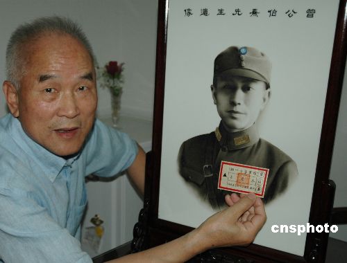 在“八·一三”淞滬抗戰(zhàn)紀(jì)念日即將到來之際,當(dāng)年中國軍隊(duì)參謀長曾伯熹佩戴的證章自臺(tái)灣回到上海。圖為黃埔后裔、曾伯熹之子曾容威在上海家中展示該證章及曾伯熹著抗日軍裝的瓷畫像,兩岸淞滬抗戰(zhàn)文物在此“團(tuán)圓”。作者:許曉青