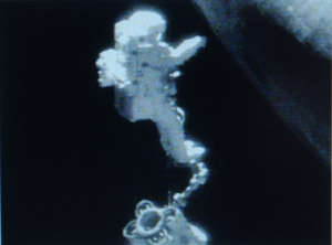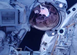 史蒂芬·羅賓遜在空間站機(jī)械臂協(xié)助下到達(dá)發(fā)現(xiàn)號前腹部,作了約五十分鐘的“太空外科手術(shù)”,順利清除隔熱瓷片縫隙凸起的填充材料。