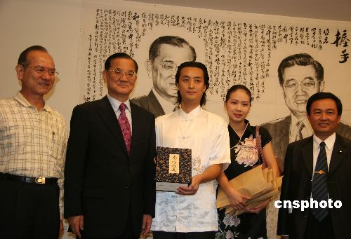 八月四日,中國國民黨主席連戰(zhàn)在臺北接受大陸畫家籍忠亮贈送現(xiàn)代水墨畫力作《歷史的握手》。該畫形象再現(xiàn)了四月二十九日連戰(zhàn)與中共中央總書記胡錦濤的歷史性握手。圖為連戰(zhàn)(左二)、國民黨秘書長林豐正(左一)在懸掛的畫作前,與籍忠亮(左三)等人合影留念。作者:董會峰