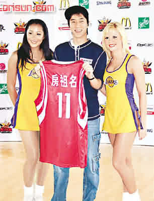 記者會(huì)上,房祖名與“金塊隊(duì)”的吉祥物大玩花式籃球及表演射籃技術(shù),有板有眼。祖名表示近日因忙于工作,所以沒有時(shí)間練習(xí)。他曾想過以籃球?yàn)榻K身職業(yè),且加入校隊(duì),問他當(dāng)時(shí)有沒有成為女同學(xué)的偶像?祖名坦白地說:“沒呀,我都想!痹瓉碜婷蚋叨葐栴},故未能實(shí)踐這個(gè)志愿,不過他抵死地說:“比賽當(dāng)日希望有女孩投懷送抱啦!倍升?jiān)硎臼莾鹤咏趟蚧@球,又大贊他投射3分球十分準(zhǔn)繩,祖名說﹕“一個(gè)人射球還可,但有人防守或現(xiàn)場氣氛不同就未必。我只識(shí)玩一些基本花式,但不會(huì)用在比賽上,因要有實(shí)力才可!