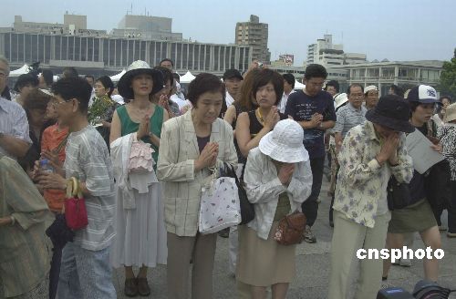 廣島市每年都要在和平公園舉行儀式。今年的紀念儀式從6日當?shù)貢r間早上8點15分準時開始,這正好是60年前美軍飛機投下原子彈的那一刻。