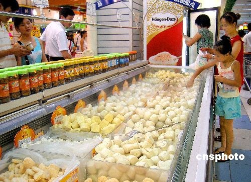 8月7日,中國食品科學技術(shù)學會專家委員會委員、天津商學院食品工程系教授張坤生近日指出,散裝速凍食品存在明顯的安全隱患。散裝銷售,無論是在銷售人員拆除大包裝散賣時,還是顧客挑選過程中,都不可避免人與食品的接觸,造成細菌污染;而散裝食品與空氣接觸面積大,還會造成水分蒸發(fā)、產(chǎn)品干裂與油脂的氧化、酸敗等現(xiàn)象,同時空氣中存在的微生物、病毒等很可能污染食物,導致食用不安全。圖為顧客在超市選購散裝速凍食品。作者:張和平