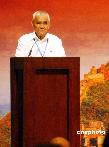 8月11日,紀(jì)念中國(guó)抗日戰(zhàn)爭(zhēng)暨世界反法西斯戰(zhàn)爭(zhēng)勝利六十周年午餐聚會(huì)在香港君悅酒店舉行,來(lái)自?xún)?nèi)地和香港的數(shù)十位抗戰(zhàn)老戰(zhàn)士相聚一堂,出席紀(jì)念活動(dòng)。圖為81歲的燕秀峰上臺(tái)演講,秀峰老人是抗戰(zhàn)電影《小兵張嘎》的原型人物。作者:潭達(dá)明