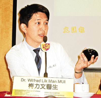 外科學系名譽臨床助理教授梅力文介紹說,胃球可注入500立方厘米的鹽水,最大直徑達15厘米。手術只花30分鐘,水球可放于胃內(nèi)6個月,并可還原或重置水球,副作用極少。