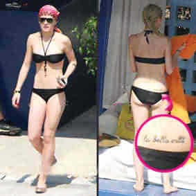 好萊塢新玉女琳賽·洛翰,在后腰部位文了一句意大利語(yǔ)“LaBellaVita”美麗人生,她的發(fā)言人說(shuō)是為了紀(jì)念她2004年去世的祖父,在葬禮上,琳賽朗誦了一首詩(shī),題目就叫《美麗人生》,半年后,她在新奧爾良拍攝電影《JustMyLuck》時(shí)文了這個(gè)文身。(據(jù)揚(yáng)子晚報(bào))