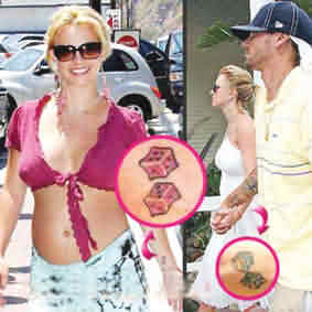 2004年5月,小甜甜布蘭妮和現(xiàn)在的老公凱文·費(fèi)德林同去愛(ài)爾蘭首都都柏林,兩人都在手腕上文了一對(duì)骰子圖案,一個(gè)紅色、一個(gè)藍(lán)色,這顯然是個(gè)幸運(yùn)的文身,一周后在返回美國(guó)的飛機(jī)上,他們訂婚了。