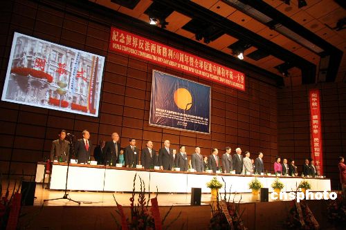 “紀念世界反法西斯戰(zhàn)爭勝利60周年暨全球促進中國和平統(tǒng)一大會”15日在歐洲名城維也納的聯(lián)合國ACV會場隆重開幕。圖為開幕式上各界代表高歌“我的中國心”。作者:鐘誠