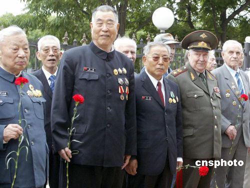 八月十八日,被邀請參加“和平使命—2005”中俄聯(lián)合軍事演習(xí)開幕儀式的中國抗日老戰(zhàn)士和前蘇聯(lián)戰(zhàn)爭功勛軍人,來到“太平洋艦隊?wèi)?zhàn)斗榮譽”紀(jì)念碑敬獻花圈,向在衛(wèi)國戰(zhàn)爭中英勇犧牲的俄羅斯軍人致以崇高的敬意。作者:王麗南