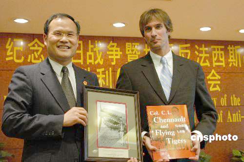 據(jù)美國《僑報》報道,在中國駐紐約總領(lǐng)館17日晚舉行的紀念抗日戰(zhàn)爭暨世界反法西斯戰(zhàn)爭勝利60周年招待會上,劉碧偉代表總領(lǐng)館,接受了這份見證中美兩國聯(lián)合抗擊法西斯侵略的珍貴紀念品。