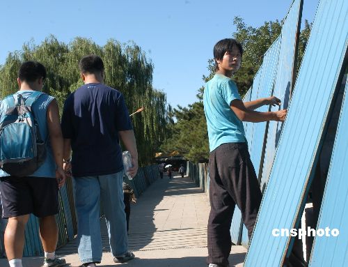 圖為圓明園三園之一的綺春園工人在繼續(xù)設(shè)置封閉鐵板。按照環(huán)?偩忠,綺春園除入水口外,已鋪防滲膜應(yīng)全部拆除,回填黏土和原湖底底泥。作者:鄒憲
