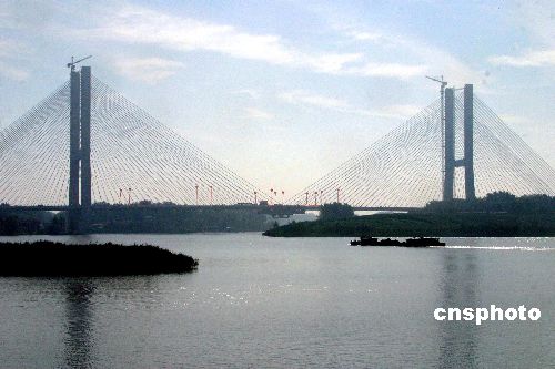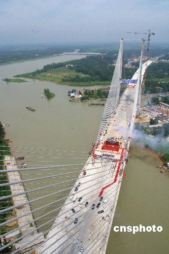 8月20日,中國(guó)主梁寬度最寬(寬度為38.6m)、承臺(tái)體積第一(橫橋向49.5 m×縱橋向33.1 m×厚6.0m)的五河口斜拉大橋合龍。五河口斜拉大橋是江蘇省宿淮、寧淮高速公路共用段的一座大橋。該橋依次跨越京杭運(yùn)河、鹽河,橋梁全長(zhǎng)2062m,工程投資約3.2億元,雙向六車道。作者:李東平