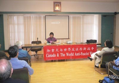 圖片展期間,中國總領(lǐng)館邀請有關(guān)學(xué)者和卑詩省抗日戰(zhàn)爭史實維護會的負(fù)責(zé)人舉辦三場抗戰(zhàn)史實講座,主題是《加拿大與世界反法西斯戰(zhàn)爭》。中新社記者呂振亞攝