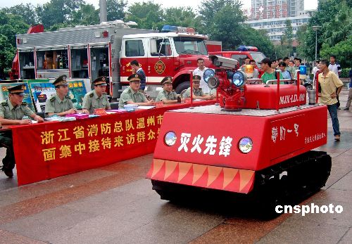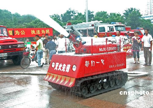 2005年8月21日上午,一輛坦克形狀的消防機(jī)器人在浙江省溫州市亮相,并在指揮人員的操控下現(xiàn)場(chǎng)進(jìn)行演練,讓市民大開(kāi)眼界。據(jù)了解,這輛無(wú)人駕駛的機(jī)器人可以在極度危險(xiǎn)環(huán)境下開(kāi)展滅火。作者:劉飛