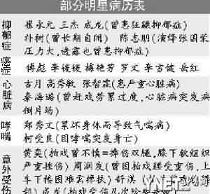 據(jù)法制晚報報道,醫(yī)生和健康專家日前指出,明星們的部分生活方式使他們在精神和體力上普遍呈過勞狀態(tài),并對健康造成致命威脅。而且,這些明星高發(fā)病同樣也威脅著普通人的健康。
