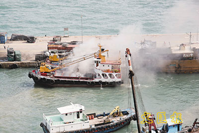 及至周一晨9時(shí)許,4人突然發(fā)現(xiàn)船倉(cāng)冒濃煙,張柏雄一馬當(dāng)先跳入船艙救火,船主張×友則繼續(xù)控制船只,并以手提電話報(bào)警求助,由于沒(méi)有網(wǎng)絡(luò)關(guān)系,欲救無(wú)從、又無(wú)法報(bào)警,張×友遂將躉船駛往3海里外的西區(qū)貨物起卸區(qū)求救。