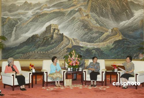 八月二十三日,全國人大常委會副委員長顧秀蓮(右二)、國僑辦主任陳玉杰(右一)在北京人民大會堂會見美大地區(qū)華僑華人婦女代表團(tuán)。來自美洲、大洋洲八個(gè)國家的六十余名華僑華人婦女杰出人士是應(yīng)國務(wù)院僑辦的邀請來華訪問的。作者:史利