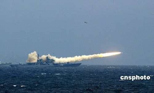 “和平使命-2005”中俄聯(lián)合軍事演習(xí)第三階段8月23日在中國山東半島及其附近海域舉行。圖為俄羅斯驅(qū)逐艦發(fā)射先進的反艦導(dǎo)彈。作者:王麗南