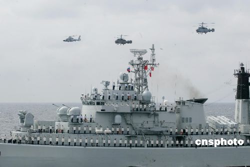 “和平使命-2005”中俄聯(lián)合軍事演習第三階段8月23日在中國山東半島及其附近海域舉行。圖為中俄艦機編隊接受聯(lián)合導演部檢閱時,中方艦艇駛過觀摩艦時情景。作者:王麗南