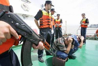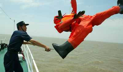 在這次演習(xí)中,靠幫和跳幫是緝私隊(duì)員著重鍛煉的兩個(gè)技術(shù)動作!吧嫦幼咚酱遣粫怨月犜捵屛覀兛可先サ!焙贾莺jP(guān)緝私局海查科長楊政說。今年1月,舟山緝私分局的一艘緝私艇在追擊一艘涉嫌走私冰凍白魚的漁船時(shí),漁船邊逃邊擺尾,緝私艇根本無法靠船跳幫。追擊了一天一夜后,在溫州緝私分局一艘緝私艇的夾擊下才終于靠近漁船,緝私隊(duì)員在兩船起伏落差較大情況下跳幫過去,控制住了走私漁船。