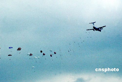 八月二十四日,“和平使命—2005”中俄聯(lián)合軍事演習(xí)第三階段兩棲登陸作戰(zhàn)實兵演練在山東半島展開。圖為參加兩棲登陸作戰(zhàn)實兵演練的中國空降兵在演練戰(zhàn)區(qū)實施跳傘。作者:王麗南