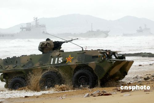 八月二十四日,盡管山東半島天氣惡劣“和平使命—2005”中俄聯合軍事演習兩棲登陸作戰(zhàn)實兵演練如期進行。圖為參加兩棲登陸作戰(zhàn)演練的裝甲車搶灘登陸。作者:王麗南