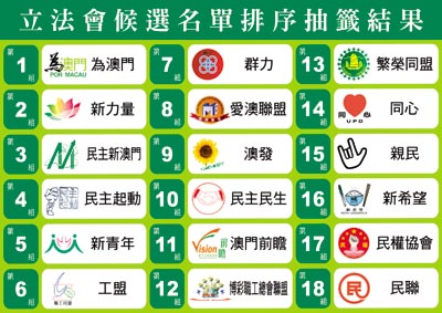 中新網(wǎng)8月25日電 據(jù)澳門(mén)日?qǐng)?bào)報(bào)道,澳門(mén)行政曁公職局二十四日抽簽,確定立法會(huì)選舉十八個(gè)直選組別在選票上的排序和選舉活動(dòng)期間識(shí)別各個(gè)候選名單。
