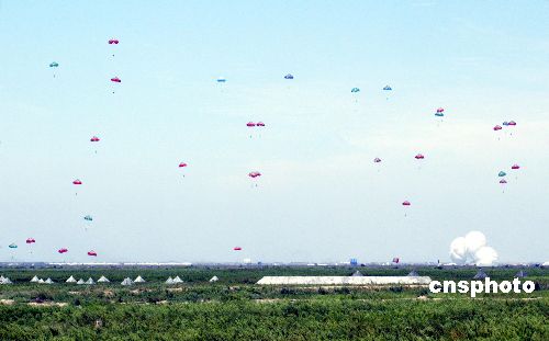 “和平使命——2005”中俄聯(lián)合軍事演習(xí)強(qiáng)制隔離演練8月25日在山東半島舉行。圖為中國空降傘兵跳傘,彩色傘花飄滿天空。作者:王麗南
