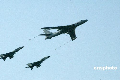 “和平使命-2005”中俄聯(lián)合軍事演習8月25日下午在山東濰北地區(qū)結束。在當日舉行的閱兵式上,中國空中加油機編隊模擬空中加油。作者:王麗南
