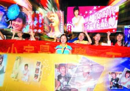 為了見到偶像,不少歌迷已經(jīng)住進了會展中心,每晚掏出400多元的房費,只為了可以在“超女”們進出房間的間隙見到偶像。有的“粉絲”已經(jīng)在這里住了十多天了,而且每天不斷有全國各地的“粉絲”入住,酒店干脆打出橫幅:“歡迎《超級女聲》來自全國各地的‘超級粉絲’”。更有神通廣大的粉絲,住到了“金牛座”里,但他們說不會影響到“超女”們的生活。在會展中心一路可以看到“筆迷”舉著周筆暢的大幅畫像出去拉票,前臺不斷有“涼粉”們登記入住。據(jù)說“玉米”是最瘋狂的“粉絲”,他們的身影在會展中心很少見,在街頭比較常見。
