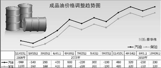 自2008年12月19日至2010年10月26日的成品油價格變化。負(fù)值為下調(diào)價格,正值為上調(diào)價格。