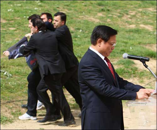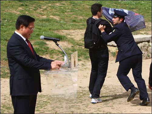 上午十一點(diǎn),圣火采集儀式正式開始。陽光明媚,暖風(fēng)習(xí)習(xí),古競技場內(nèi)綠草茵茵,春花爛漫,一切都顯得生機(jī)盎然,現(xiàn)場氣氛神圣而祥和。儀式進(jìn)行了十幾分鐘,北京奧組委主席劉淇上前開始發(fā)表講話,這時(shí),記者看見來賓席上突然躥出一個(gè)人,他奔向劉淇,在劉淇身旁展開一個(gè)橫幅,另有兩個(gè)顯然是他同伙的人也加入進(jìn)來發(fā)難。但他們迅即被在場的希臘警察制服,并被帶離現(xiàn)場。在這一不到兩分鐘的過程中,劉淇繼續(xù)沉穩(wěn)莊嚴(yán)地發(fā)表講話,未受到任何影響。當(dāng)劉淇主席講話結(jié)束和會(huì)場傳來北京奧運(yùn)圣火在赫拉神廟前已點(diǎn)燃的消息時(shí),整個(gè)現(xiàn)場響起了雷鳴般的掌聲,在場的人們用這種方式表達(dá)了對奧運(yùn)的熱愛和對北京奧運(yùn)會(huì)的祝福。整個(gè)儀式按既定程序進(jìn)行,那場小鬧劇也成了全世界愛好和平、熱愛奧運(yùn)的人們的笑柄。