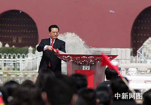 3月31日,北京奧運會圣火歡迎儀式暨傳遞啟動儀式在北京天安門廣場啟動。圖為胡錦濤主席在眾人的注視下,用火炬點燃圣火盆。中新社發(fā) 張宇 攝