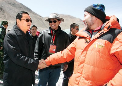 3月30日,在日喀則檢查指導(dǎo)維護(hù)穩(wěn)定和邊境管理工作的自治區(qū)黨委副書(shū)記、自治區(qū)常務(wù)副主席郝鵬,公安部副部長(zhǎng)張新楓,帶領(lǐng)工作組一行專(zhuān)程前往珠峰大本營(yíng),檢查北京奧運(yùn)會(huì)火炬登頂珠峰的安全保障工作情況。