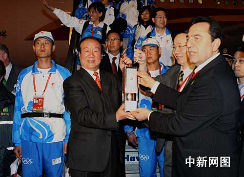 中新社伊斯坦布爾四月三日電(記者 沈晨)當?shù)貢r間三日零時,北京奧組委執(zhí)行副主席蔣效愚手持圣火燈走下舷梯,宣告北京奧運會圣火抵達歐亞兩洲的交匯點——土耳其歷史名城伊斯坦布爾。